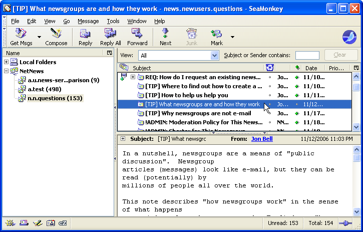 To read articles in a group click the group name in that list. SeaMonkey will retrieve the available articles. When fetching articles for the first time SeaMonkey asks you for the username and the password.