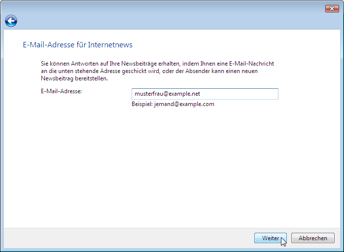Geben dann Sie bitte hinter E-Mail-Adresse Ihre korrekte E-Mail-Adresse an. Klicken Sie auf die Schaltfläche Weiter.